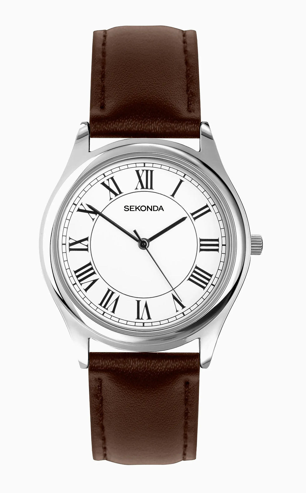 Solid stainless steel case, hardened mineral crystal paired with a wide leather strap with 18 different dial/band combinations to choose from.